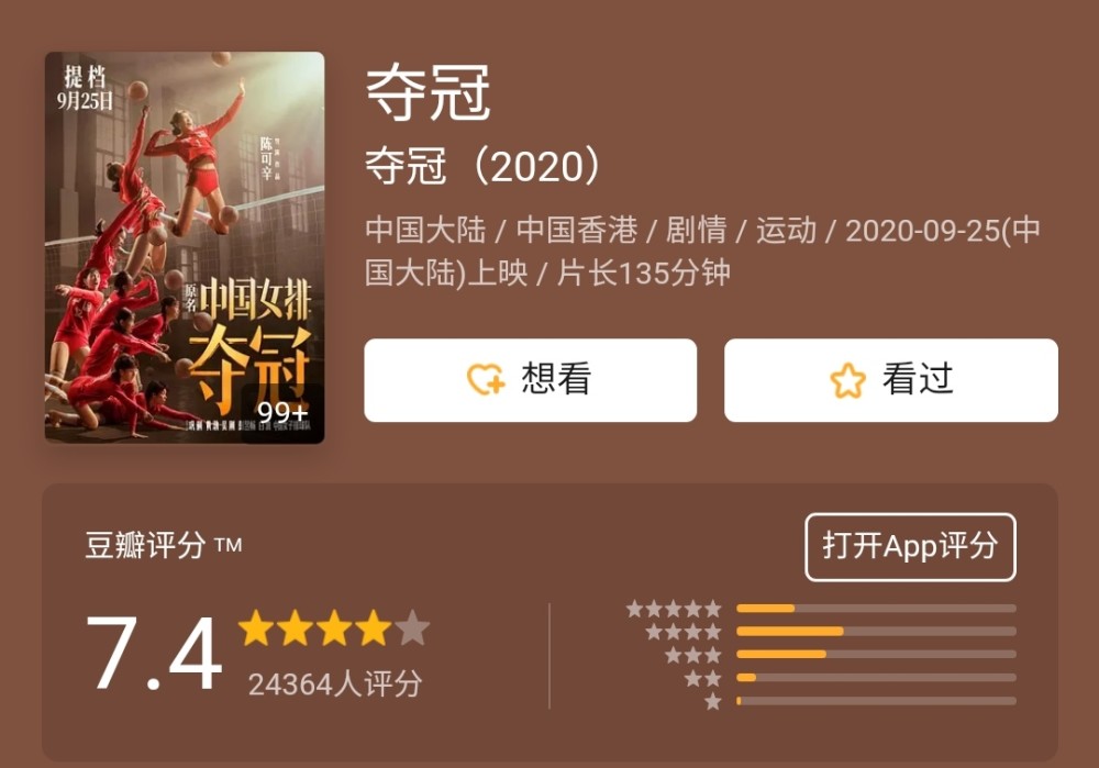 目前,《夺冠》稳居票房的榜首,豆瓣评分达到7.4的高分,可谓是票房口碑双丰收,实属难得。