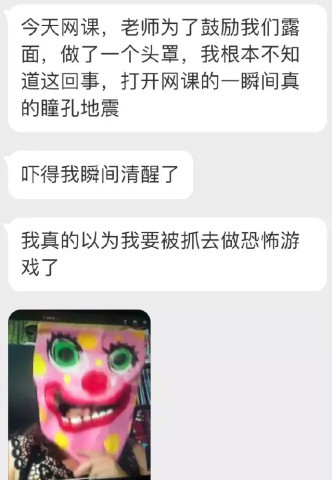 上彀课时,老师原本是鼓励我们露面,做了一个面罩,只因我没有好好听课,不知道这事,在打开网课的一瞬间吓的我困意全无,老师你这不是鼓励,是惊吓好嘛?哈哈哈哈.......