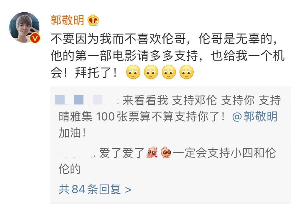 然而就在今天,热搜#郭敬明 不要因为我而不喜欢邓伦#出来后,突然觉得,对于郭敬明,网友的评论真的有点恶意满满的感觉呀。据悉,事情的起因是有网友转发邓伦微博:“挺喜欢邓伦但不喜欢郭敬明”。而郭敬明在看到这一条评论之后,便回复了一句: 不要因为我而不喜欢伦哥,伦哥是无辜的,他的第一部电影请多多支持,也给我一个机会!拜托了!