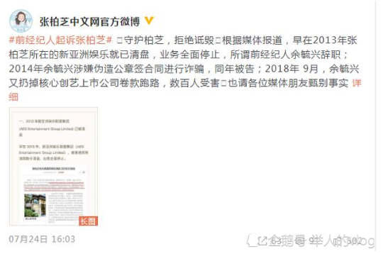 张柏芝在微博回应说,早在2013年自己所在的新亚洲娱乐就已清盘,业务全面停止,前经纪人余毓兴也早已经辞职,2014年,余毓兴伪造公章进行合同诈骗,同年被告,2018年,余毓兴扔掉核心创意上市公司捐款跑路,导致数百人受害,希望各位媒体朋友甄别事实后再报道。