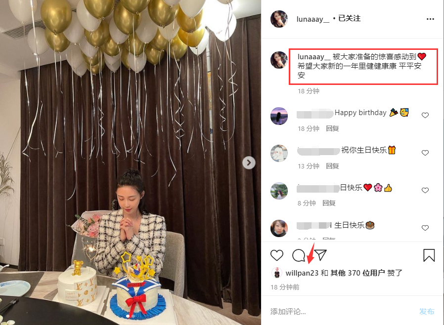 1月18日潘玮柏娇妻宣云Luna更新社交动态,本日是Luna的生日,她晒出两张庆生照,并感谢亲朋给予她的惊喜“被大家准备的惊喜感动到 希望大家新的一年里健健康康 平平安安”。