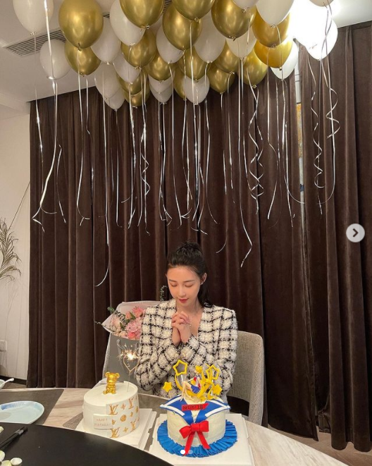 宣云晒出自己许愿的生日照,她双手合十十分诚心,面前摆放着两个生日蛋糕,一个是水冰月造型,另一个是印有LV标识的生日蛋糕。