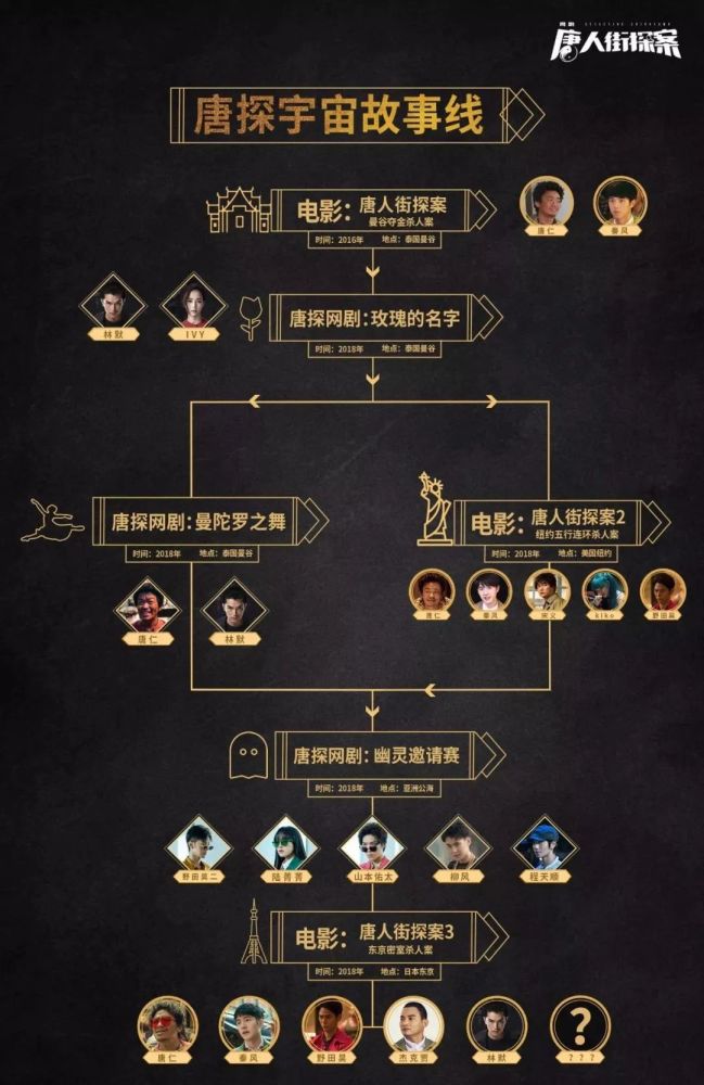 然后经过网剧《唐人街探案》的发酵,几个重要的剧情悬念都留到了《唐探3》。