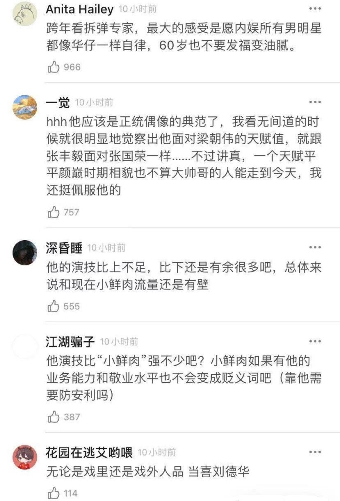有一些年轻的网友表示:刘德华的演技不怎么样,只是因为红得够久,熬成了“老戏骨”。实在,红得久也算是一种能力,如果演戏欠好,唱功欠好,怎么可能红这么久呢?如果小鲜肉能像刘德华这么敬业,那娱乐圈就太繁荣了。