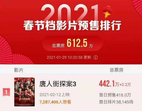 2021年1月29日,春节档预售正式开启,从开闸那一刻开始《唐探3》便一骑绝尘,140分钟后,612万的票房里它占了442万,直接用数据占比证明: