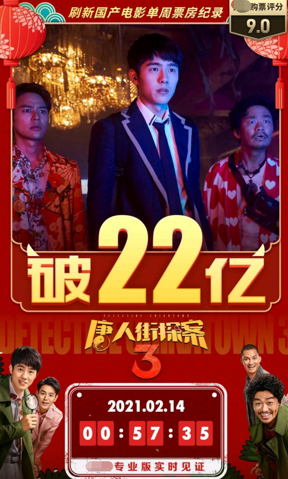 票房第二的《你好,李焕英》票房不及《唐探3》的一半,它以横扫千军的姿态称霸春节档,坐拥春节档的荆棘铜驼,其他电影只能在《唐探3》的胯下苟活,搜刮骨头上的残渣。
